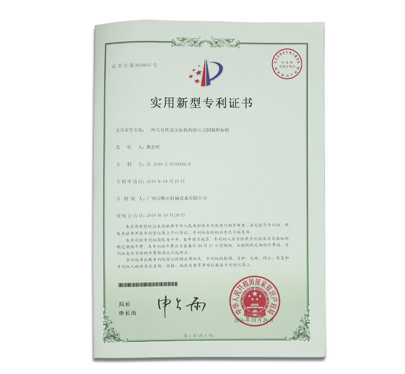 騰卓機械專利生產證書,專業(yè)制造包裝設備的生產廠家,全自動及半自動的洗瓶機,烘干機,灌裝機,旋蓋機,貼標機,套標機,打碼機等非標定制自動化包裝生產線