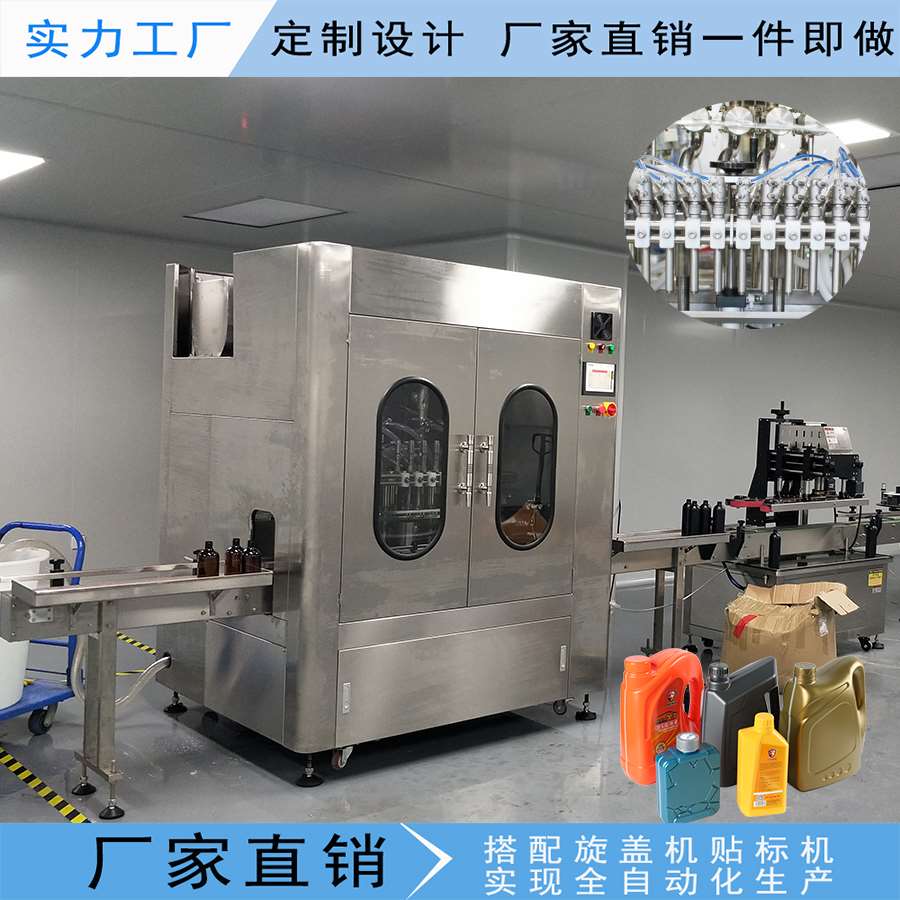此生產(chǎn)線主要應(yīng)用于日化廠,化工廠,汽車用品等行業(yè)。例如:洗衣液,洗潔精,洗發(fā)水,沐浴露,潤滑油,剎車油,汽油添加劑等,設(shè)備采用先進(jìn)的光、電、氣一體化自動(dòng)控制系統(tǒng),實(shí)現(xiàn)進(jìn)瓶,定位,灌裝,出瓶自動(dòng)化生產(chǎn)。