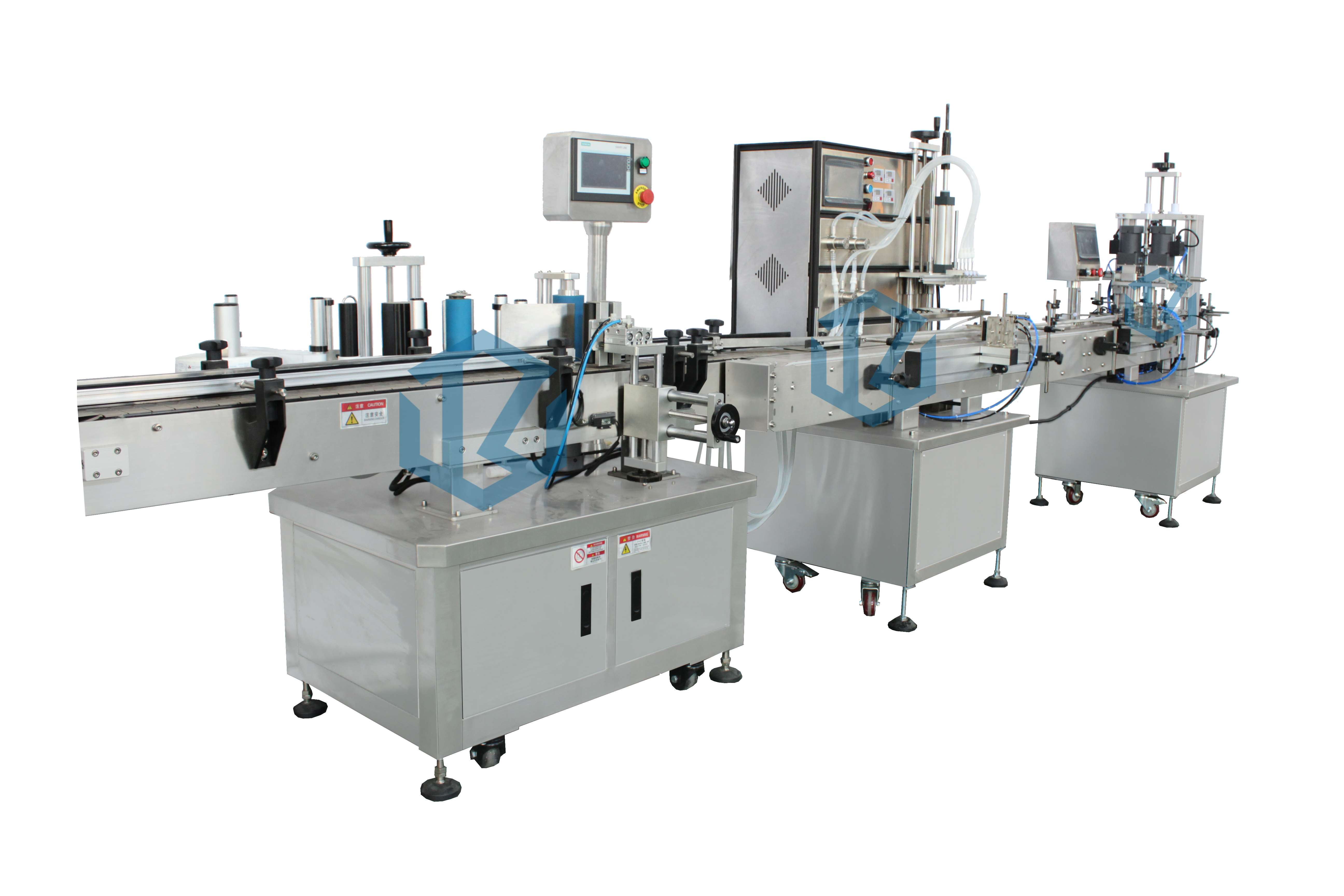 完成動作:人工放瓶-自動灌裝-機器放蓋-自動旋蓋–自動貼標-人工收瓶